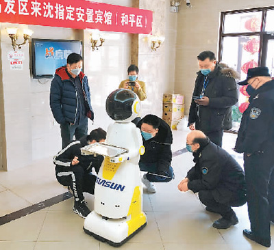 沈阳新松机器人自动化股份有限公司技术人员在疫情高发区来沈指定安置宾馆调试智能送餐机器人。