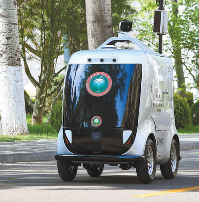 4月6日,在北京理工大学中关村校区,无人配送车在配送物品。
