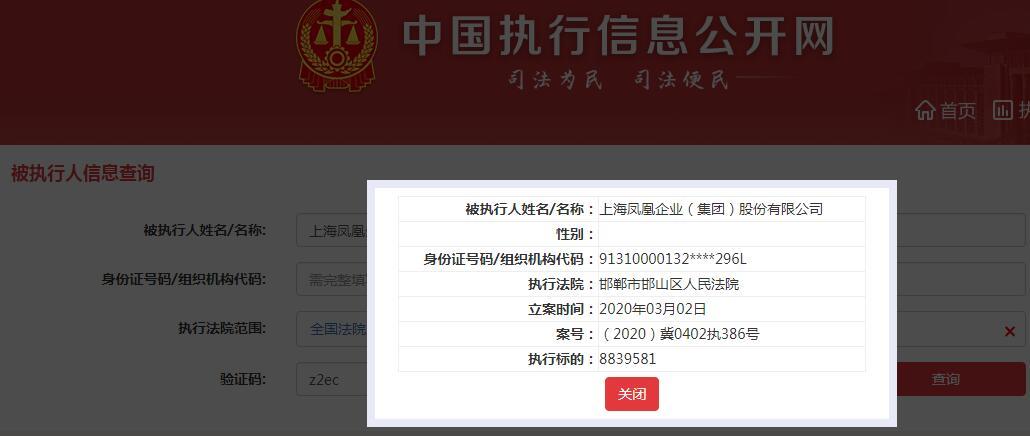 中国执行信息公开网显示,3月2日,上海凤凰企业(集团)股份有限公司被列入被执行人名单,立案时间为2020年03月02日,执行法院为邯郸市邯山区人民法院。执行标的为8839581(元),案号为(2020)冀0402执386号。