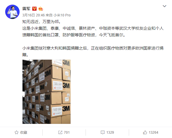消息显示,随着韩国疫情持续扩散,武汉大学校友企业家们感恩在心,泰康溢彩基金会筹100万人民币,小米集团、中诚信集团、景林资产、中珈资本、蹇宏等企业和个人共筹款391万人民币,通过大韩红十字社向大邱和坡州捐赠物资。武汉、上海、常州、无锡和韩国等地校友会高效联动,在江苏工信厅、上海浦东机场等支持下保障物资采购并顺利集结抵韩。
