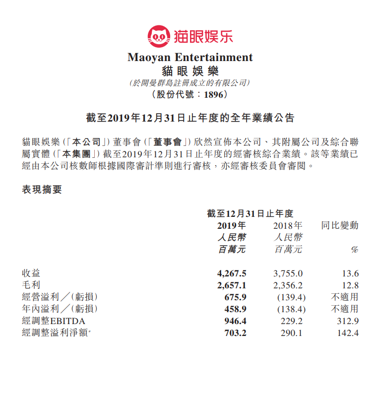 中国网科技3月25日讯 猫眼娱乐昨日发布2019年业绩报告。2019年,公司总收入42.66亿元,同比增长13.6%;毛利26.57亿元,同比增长12.8%;全年盈利4.59亿元,转亏为盈。