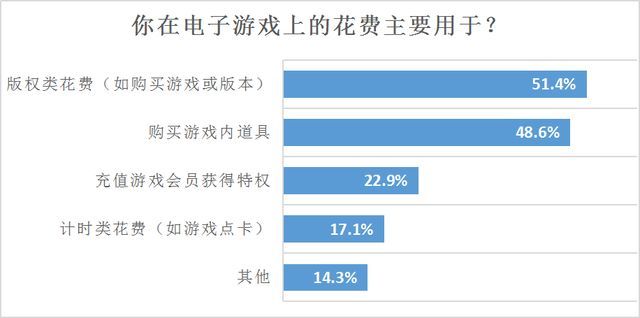 调查中问及受访者具体购买了哪些游戏内容时,有51.4%表示钱主要花在了购买游戏卡带或付费版本上;也有48.6%表示购买了游戏内道具;还有22.9%表示充值了游戏会员。由于游戏主机、实体卡带等产品价格往往较高,这或许是近期部分消费者在游戏上消费金额较高的原因。