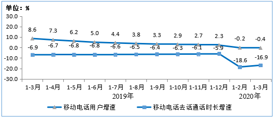 图7 2019年-2020年1-3月移动电话用户增速和通话时长增速