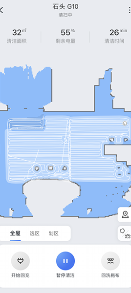 讲完外观,下面我们就来重点说一下石头G10的功能体验。石头G10是一款更聪明的扫拖机器人,继承了石头科技旗下所有扫地机器人优点的同时,还能够自动判断是否需要回洗拖布,如果需要,机器人自动导航回到基座,并在基座的配合下完成自动补水和自动清洁拖布的过程。