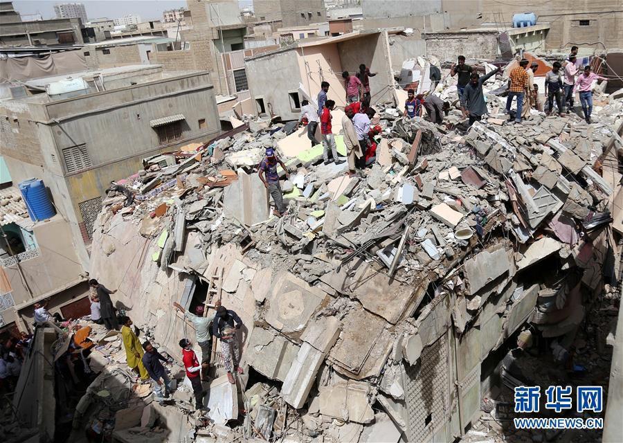 3月5日,在巴基斯坦卡拉奇,救援人员在居民楼倒塌事故现场展开救援。 新华社发