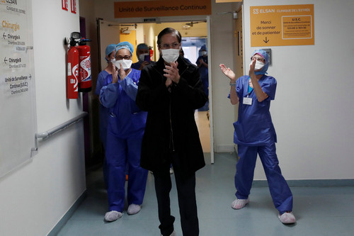 法国巴黎一家医院的工作人员23日为出院的新冠肺炎康复患者鼓掌(路透社)