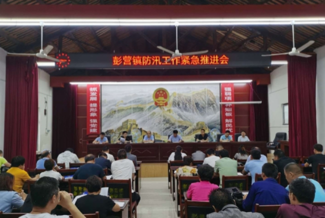 7月22日上午,镇平县彭营镇召开由全体班子成员、包村干部、行政村支部书记参加的防汛工作紧急推进会。
