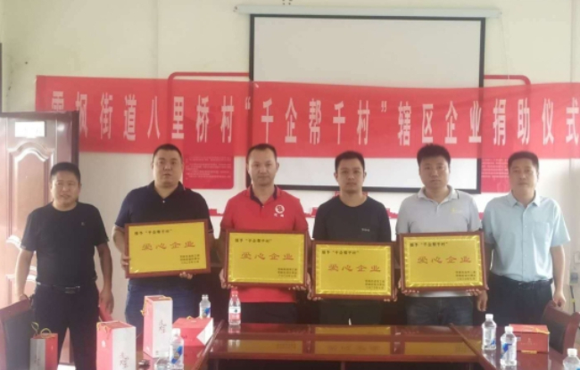 7月28日上午,镇平县雪枫街道组织腾信光电、心粮宠物食品、朴欣肥业、乾源食业四家企业在八里桥村部举行“燃气进村入户”企业捐助仪式。办事处主任孟凡润及相关部门负责人出席会议并为企业颁发奖牌。