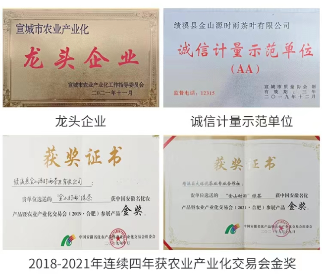 绩溪县金山源时雨茶业有限公司,“金山时雨”品牌持有企业,位于金山时雨绿茶原产地核心产区安徽省绩溪县金山村,是绩溪县乡村振兴战略“政府+龙头企业+合作社+农户”模式的关键组成部分之一。在乡村振兴战略的正确指引下,绩溪县金山源时雨茶业有限公司充分发挥龙头企业带动优势,全方位打造“金山时雨”品牌:制定金山时雨茶叶地方标准,保护产品品牌、质量、特色和传统工艺;相继完成SC认证、绿色食品A级认证,保护无形资产的价值,进一步防止假冒伪劣产品的产生;建立“金山时雨”标准化核心示范基地省级家庭农场,向标准化、品牌化生产迈进;坚持秉承“金山时雨”绿茶传统风味并不断创新工艺,持续提升设备先进性,在茶叶机械化生产上逐步探索前行。目前该公司不仅实现了从小型单机、燃柴单机向燃电、燃气高效环保半自动化生产线的完美蜕变,获得了若干项绿茶制作工艺方面实用新型专利,更有效提高了品牌影响力,做出了有口皆碑的一杯好茶,带领众多茶区农户增产增收。