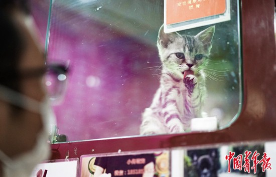 北京三里屯一宠物店内,一位顾客正在观察小猫洗脸。