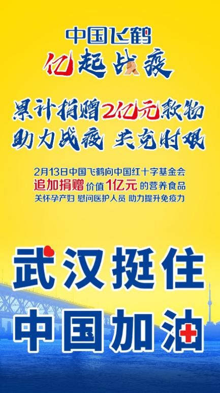 在疫情之初,中国飞鹤当即设立1亿元战疫专项资金,分别用于医务人员人道救助、疫情防控一线医院建设、医疗防控物资采购等,随后又追加价值1亿元的营养食品,用于慰问湖北、黑龙江一线医护人员及全国疫情影响区域内的孕产妇群体的营养补充和帮助。