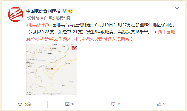 人民网北京1月19日电 中国地震台网正式测定:01月19日21时27分在新疆喀什地区伽师县(北纬39.83度,东经77.21度)发生6.4级地震,震源深度16千米。震中附近震感强烈。