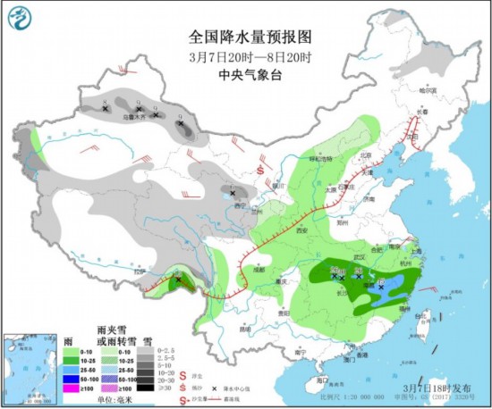 图2 全国降水量预报图(3月7日20时-8日20时)