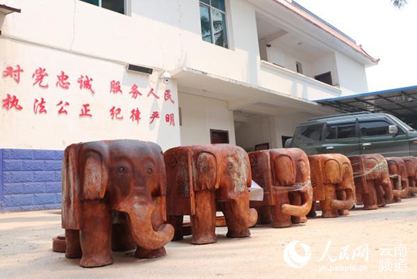 在随后检查中,民警发现可疑面包车内的8个大象木雕重量偏轻,且顶部均有拼接痕迹,撬开后,这8个木雕内塞满了总重近44公斤的冰毒可疑物。